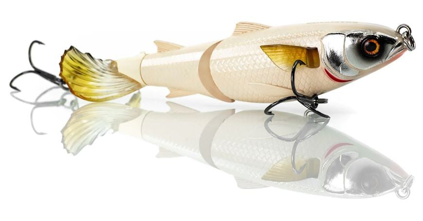 On the slow retrieve the DRUNKEN MULLET looks like an exhausted fish on its last legs or like its just consumed a bottle of rum staggering home from the pub. The unbalanced ‘Pop Tail’ and body segments combine to give it that unique dying/drunk action that will remind you of last Saturday night.